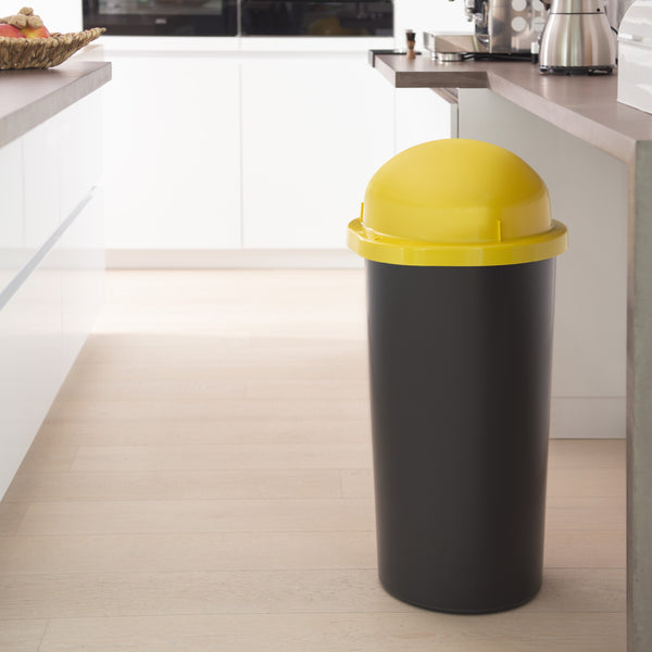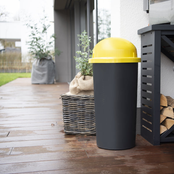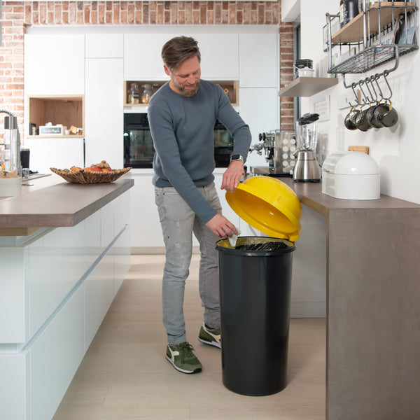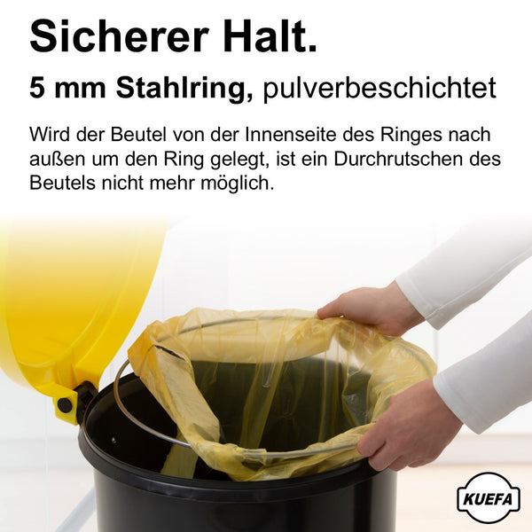 Der robuste und wetterfeste KUEFA Sammelbehälter besteht aus einer wasserdichten Kunststofftonne mit praktischem Scharnierdeckel und beschichtetem Stahlring zur Befestigung des Abfallbeutels. Durch die einfache und effektive Halterung verschwindet der Müllsack vollständig im Unterteil und ist im geschlossenen Zustand nicht mehr zu sehen. Der demontierbare Deckel schließt den Behälter geruchsdicht ab und verhindert, dass Insekten, Katzen und Nagetiere den Müllsack beschädigen. Das zusätzliche Volumen des Deckels sorgt stets für eine gute Füllung der Gelben Säcke. Der Wertstoffsammler ist für Gelbe Säcke mit einer Breite größer 59 cm ausgelegt. Der KUEFA Sammelbehälter mit Scharnierdeckel eignet sich besonders für die Verwendung im Außenbereich und ist auch für den gewerblichen Einsatz bestens gerüstet.